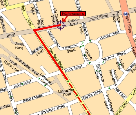Arrivés au croisement de Oxford Street et de New Bond Street, nous interpellons l'un des employés de la librairie présents un peu partout dans la queue pour renseigner les clients désireux de l'intégrer : « S'il vous plaît, c'est ici pour se joindre à la queue ? ». À ces mots, l'employée laisse un moment de silence puis esquisse un sourire : « Non mes amis ! Je vais vous montrer... ». Elle nous indique la New Bond Street. « C'est tout là-bas ». La file se prolonge dans toute la rue adjacente ! (Le parcours de la queue est indiqué en rouge sur la carte à gauche)